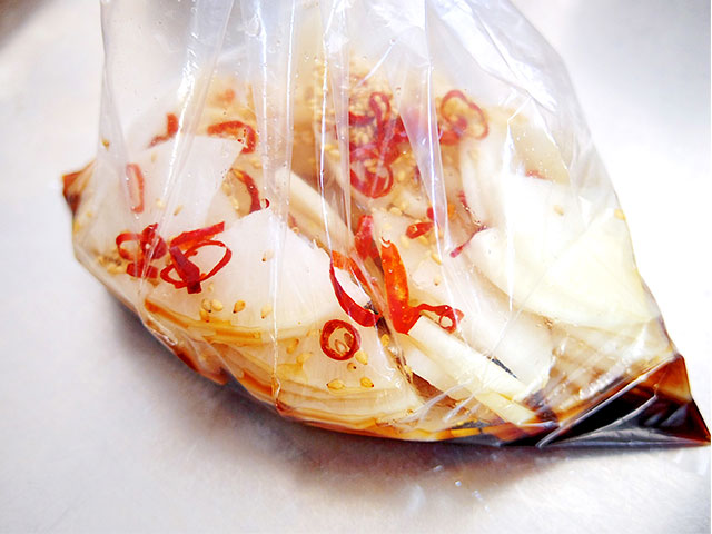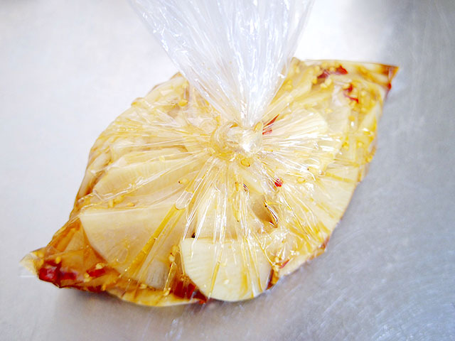 2.全ての材料をビニール袋に入れて少し揉み、ビニール袋の中の空気を抜くようにして口を縛る。