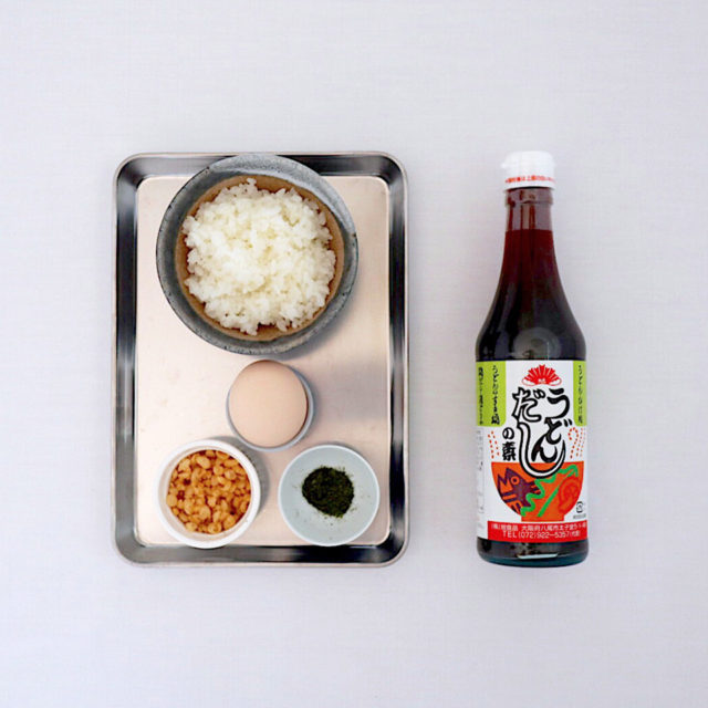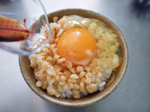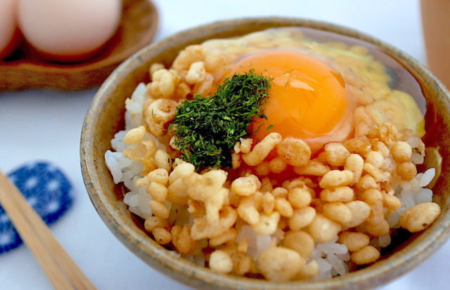 1.温かいご飯に、天かすをのせその上に卵を乗せる。