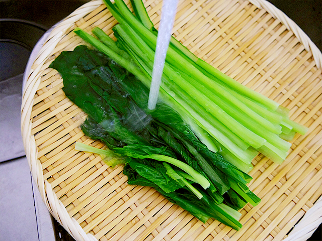 3.茹でた小松菜を冷水にさらす。