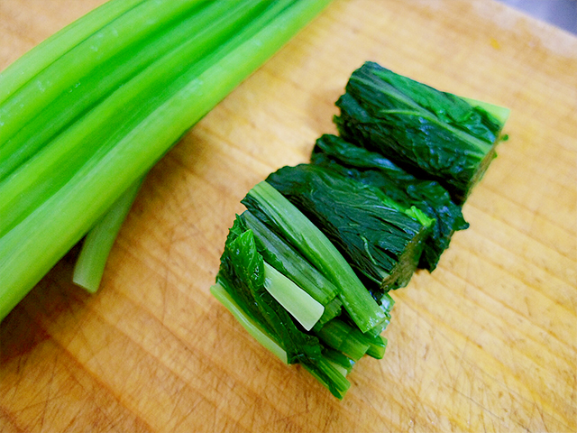 1.小松菜を茎と葉っぱと切り分け、お湯を沸かしておく。
