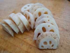 1.蓮根はよく洗い、皮ごと1cm幅の半月型に切る。