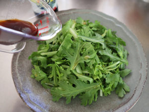 1.春菊はよく洗い水気をしっかり切ったら、3〜4cm程の長さに切る。