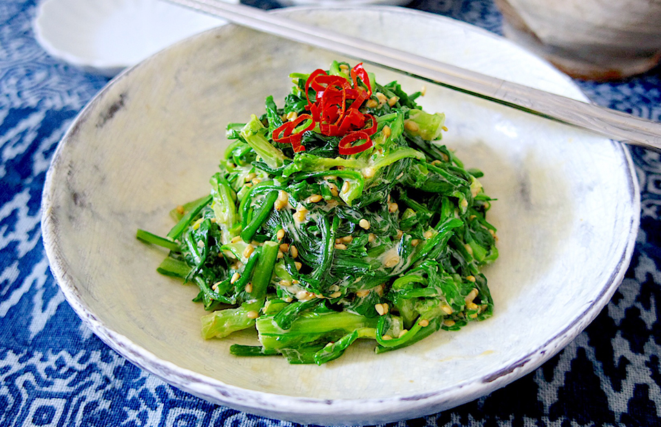 旬の野菜で栄養たっぷり!時短でパパッと作れる春菊のピリ辛ごま和え。