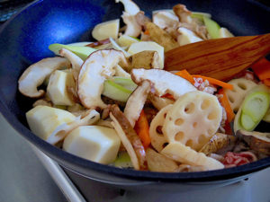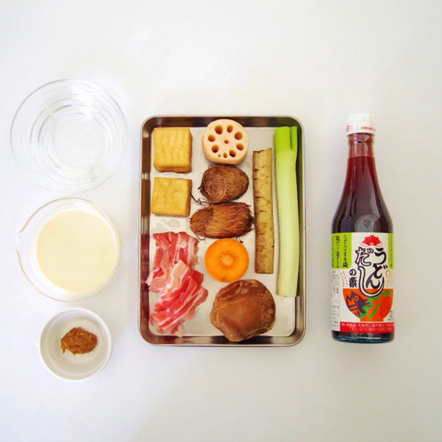 人参は短冊切りに、蓮根は5mm程の輪切りに、白ネギは8mm程の斜め切りに、ごぼうと里芋、厚揚げに豚バラ肉は食べやすい大きさに切りわける。