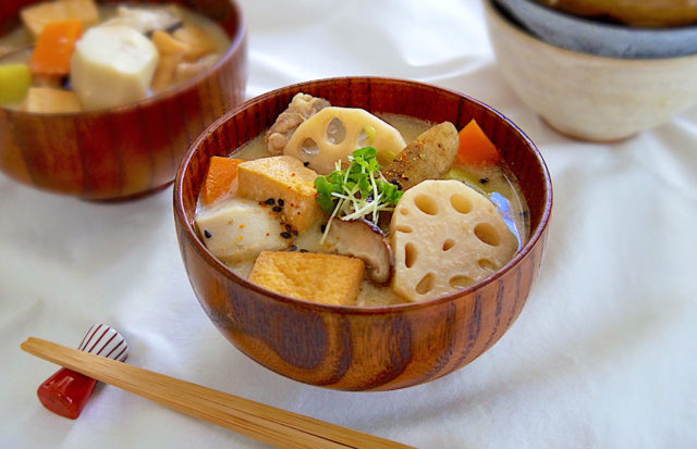 ほっこり温まる♪根菜豆乳味噌汁です♪(調理時間25分 / 1人前262kcal)