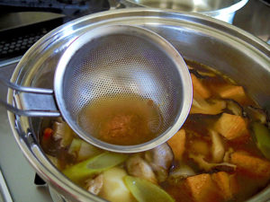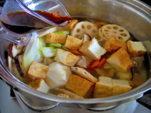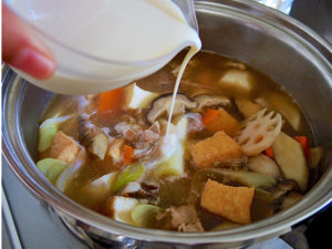 4.炒めた具材を鍋にうつしかえ、水とうどんだしの素を加えて野菜に火が通るまで煮込む。