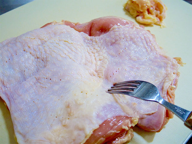 余分な脂をとったら、皮目にフォークで何ヶ所か穴をあける。