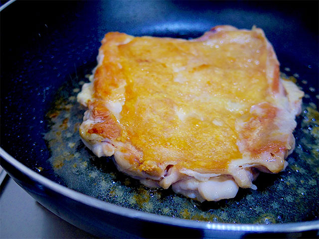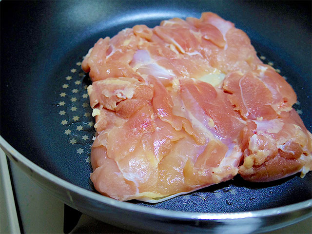 2.鶏肉から水気が出てくるので水気ををふいたら、冷たいままのフライパンにサラダ油をひき、皮目を下に鶏肉を置き、火にかける。