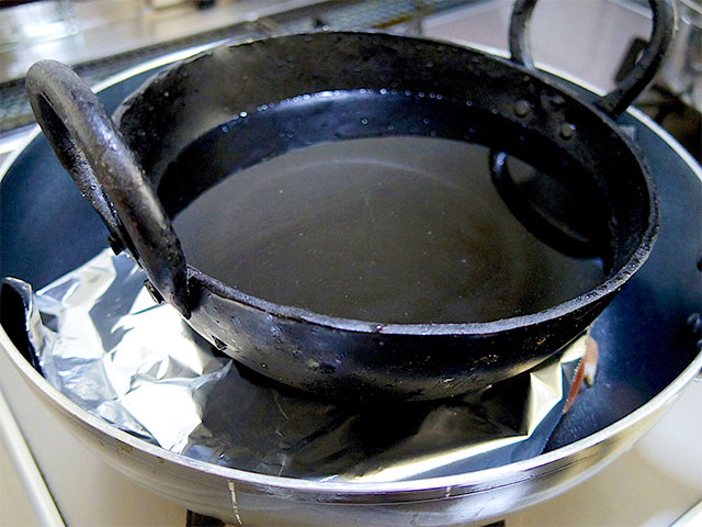 3.鍋かやかんに水を張って重石を作り、鶏肉の上にアルミホイルを乗せて、その上に重石をして8分ほど焼く。(弱めの中火ぐらいで)