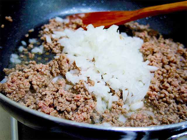 3.フライパンに残りのオリーブオイルを入れひき肉を炒めます。