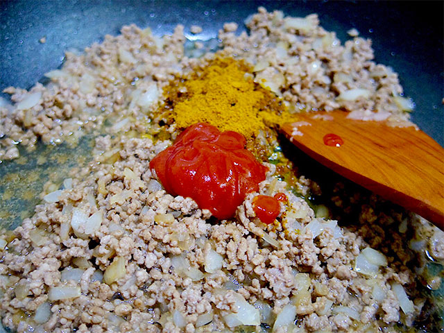4.カレー粉、ケチャップ、コショウも加えて炒め合わせる。