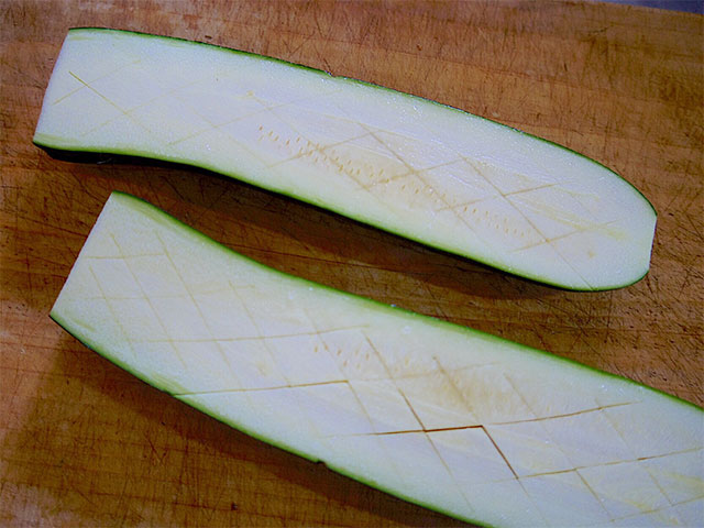 1.ズッキーニのヘタを切り、縦半分にカット。断面に斜め格子状に切り目を入れる。玉ねぎはみじん切りにしておく。