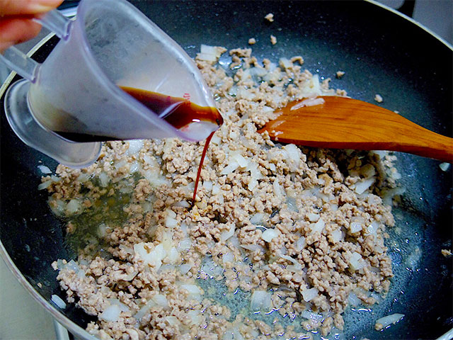 色が変わってきたら、みじん切りした玉ねぎを加えて玉ねぎが透き通るまで炒めたらそばつゆの素を加える。