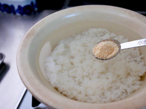 2.鍋に水とご飯、鶏ガラスープを入れてひと煮立ちさせる。
