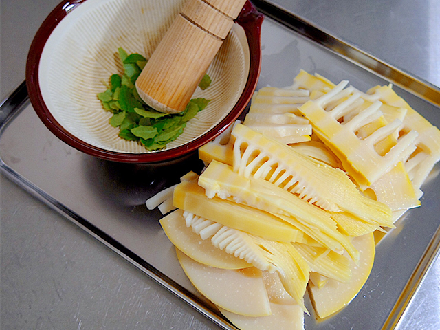 1.筍を食べやすい大きさにスライスし、木の芽はすり鉢で擦っておきます。