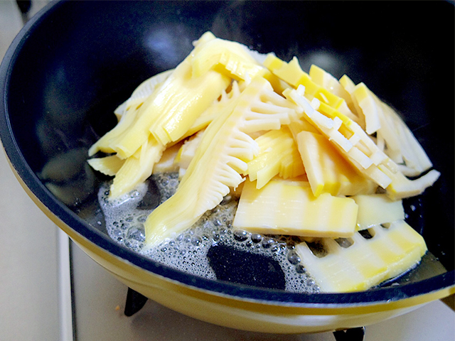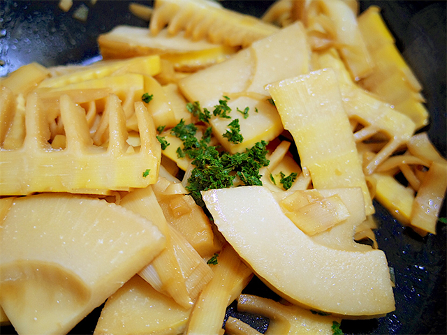 2.熱したフライパンにバターを入れ、そして筍を入れて焼き目がつくまで焼いていきます。