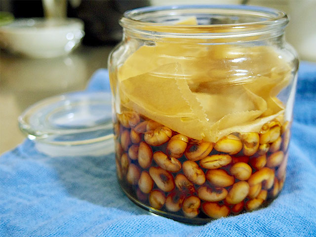 3.炒めた大豆を温かいうちにそばつゆの素と水を混ぜておいた瓶に入れかき混ぜ、