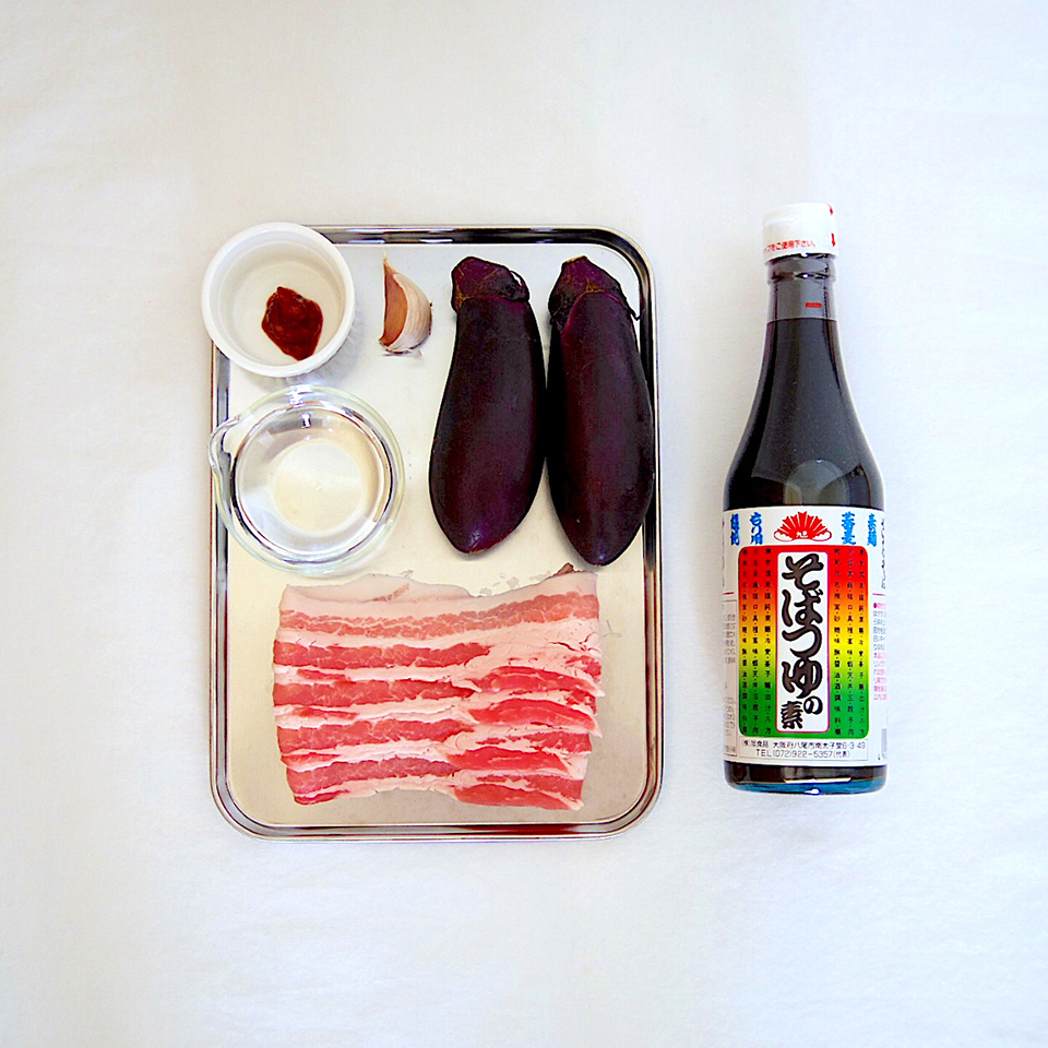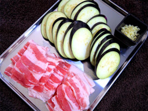 1.茄子は5mm幅の斜め輪切りに、豚バラは5~6cmほどに切り