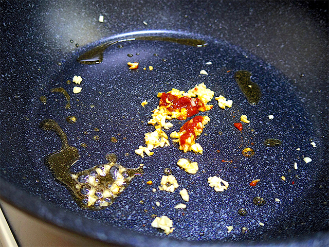 2.熱したフライパンに多めの油をひき、ニンニクと豆板醤を炒める。