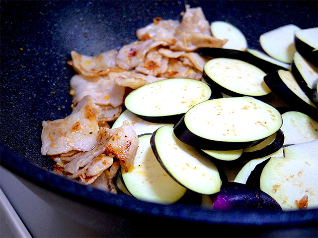 3.香りがしてきたら、豚バラ肉を焼き目がつくまで炒め、茄子を加えて炒める。