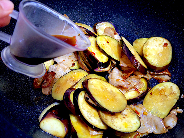 4.茄子がしんなりしてきたら、そばつゆの素と水を混ぜたものを回し入れ、さっと炒めたらできあがり。
