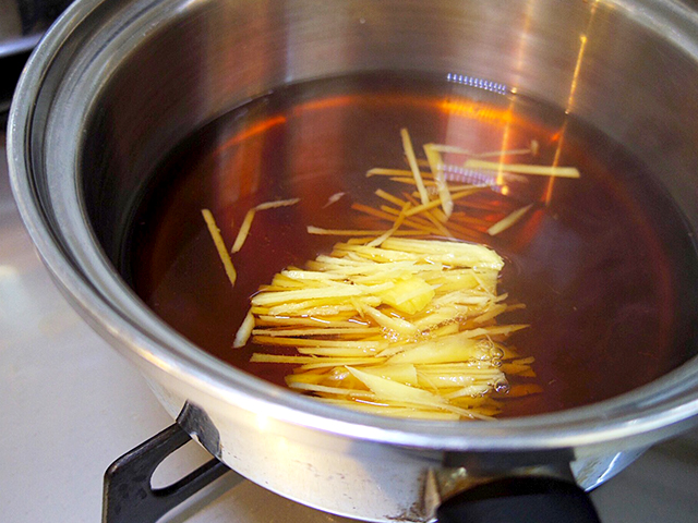 2.そばつゆと水、生姜をお鍋に入れ火にかけておきます。