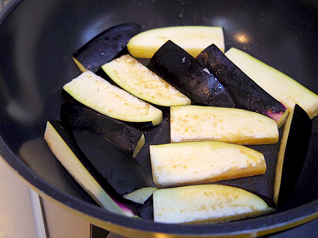 3.熱したフライパンにごま油を入れて茄子を焼いていきます。