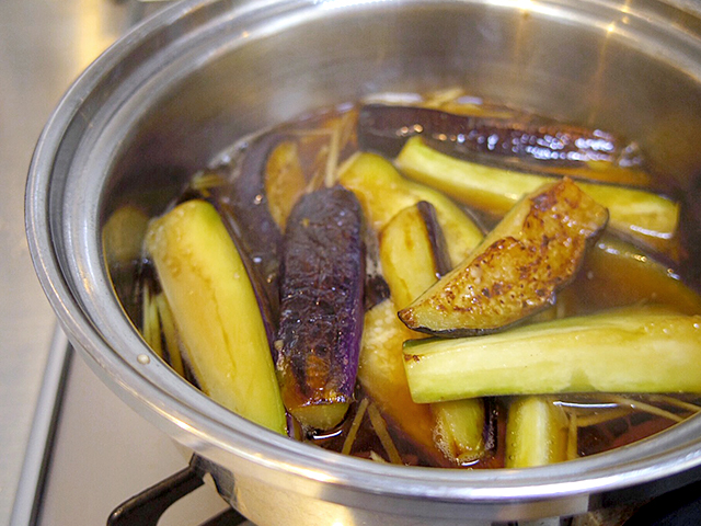 4.焼き目がついてきたら、鍋に入れた煮汁に入れていき5分ほど煮込みひと休みさせたら茄子の煮物のできあがり。
