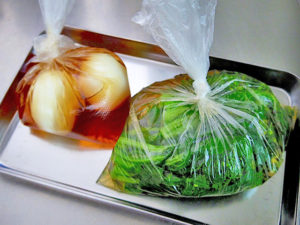 4.ゆで卵は皮を剥き、菜の花とをそれぞれビニール袋に入れ、水とうどんだしの素を加えて空気を抜いて口をしばってひと晩冷蔵庫で寝かせる。