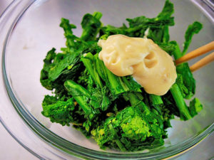 6.菜の花に辛子とマヨネーズに、塩ひとつまみを加えて和える。