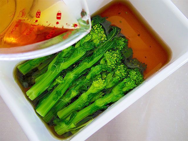 4.容器に菜の花と出汁(うどんだしの素と水)を入れ1時間以上寝かせたらできあがり。