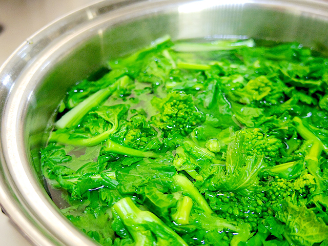 3.沸騰したお湯に茎→葉の順に入れて湯がいていく。