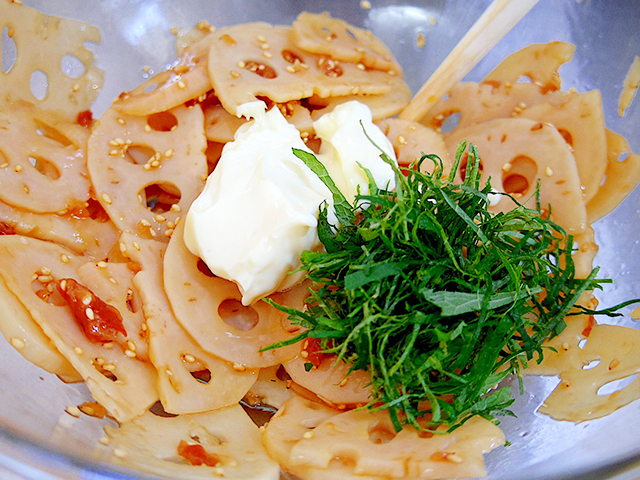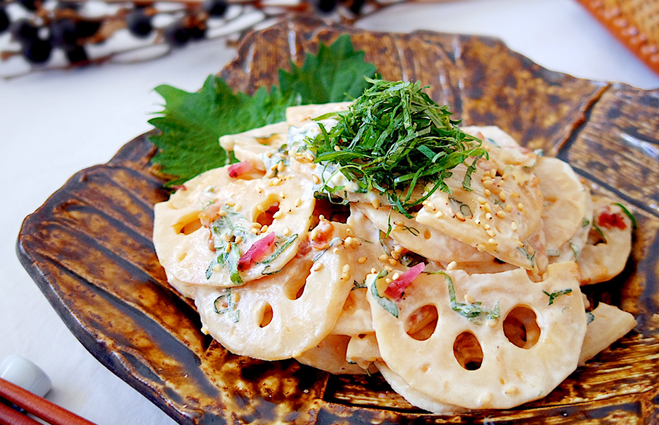 シャキシャキ蓮根にさっぱり&まろやかな味付けが抜群の組み合わせの蓮根マヨサラダです。