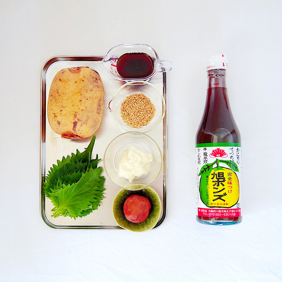 4.粗熱が取れたらマヨネーズ、胡麻、梅、大葉を混ぜ合わせたらできあがり。