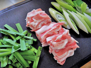 1.ニラは3cm程に切り、白ネギは1cm幅ぐらいの斜め切りにし豚肉は食べやすい大きさに切る。