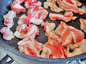 2.フライパンに胡麻油小1をひき、豚肉を炒める。