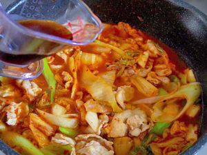 4.全体に火が入ったら、水とうどんだしの素を加えてひと煮立ちさせる。