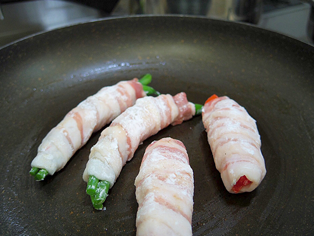 2.野菜を豚バラ肉で巻いていき、片栗粉を薄く付ける。