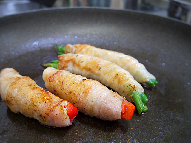 3.薄く胡麻油をひいたフライパンに豚バラ肉の巻き終わりを下にして並べていき、フライパンに火を付ける。