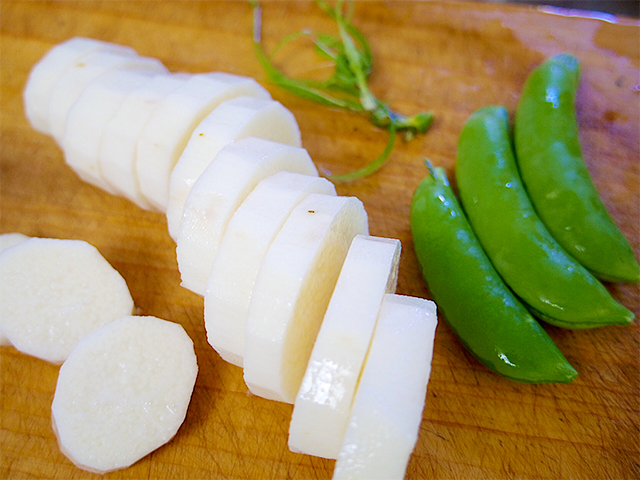1.スナップえんどうは筋を取り、長芋は皮を剥き8mm幅の輪切りにしておく。