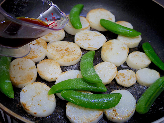 焼き目がついたらスナップえんどうと旭ぶっかけポンズを加え炒める。