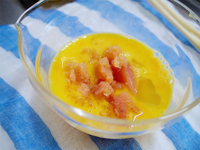 1.明太子を、ほぐし溶いた卵の中に入れまぜておく。