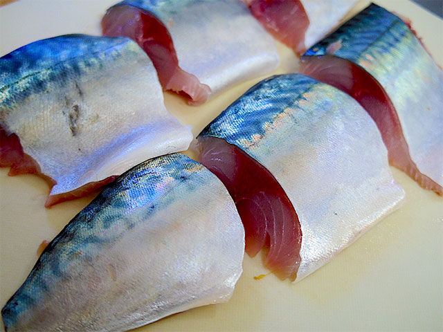 2.鯖は長さを3等分か半分のそぎ切りにし、
