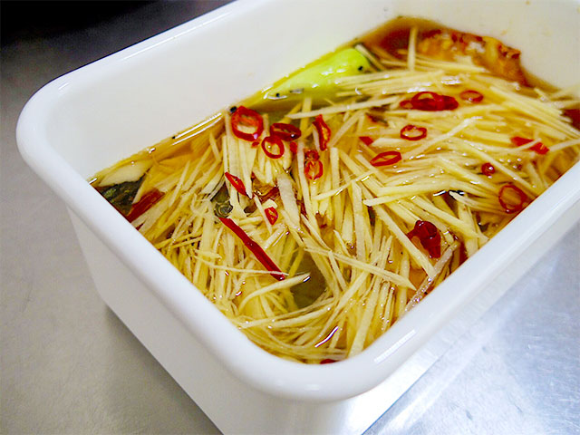 漬けだれを注ぎ、輪切り唐辛子と千切りにした生姜をのせる。