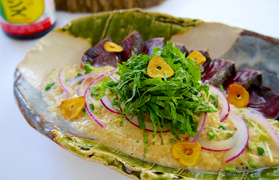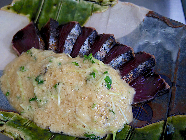 5.鰹のたたきを食べやすい大きさに切り、とろろポン酢をかける。