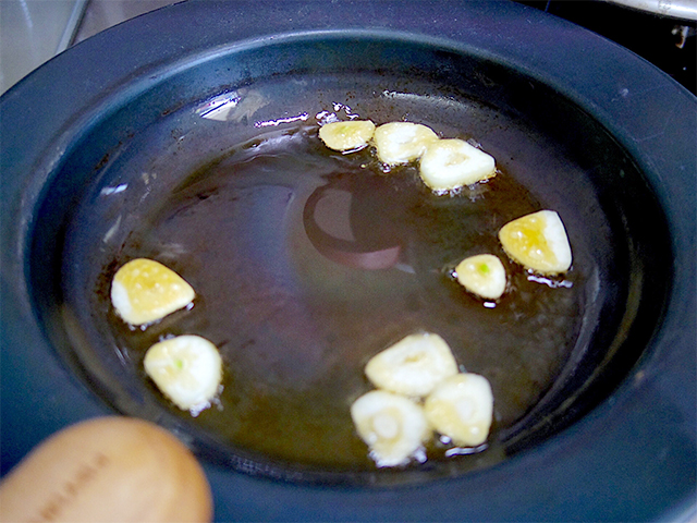1.ニンニクはスライスして、フライパンに油(分量外)を入れて揚げ、ニンニクチップを作る。