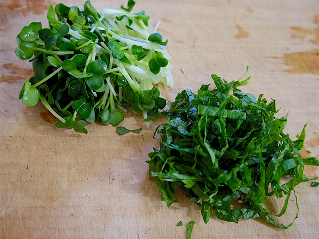 2.大葉は千切り、かいわれ大根は長さを3等分にしておく。