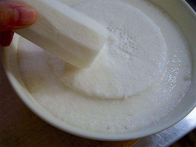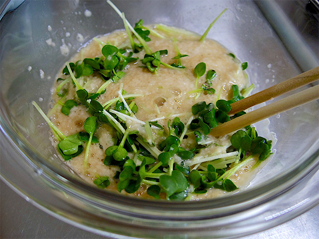 4.すりおろした長芋に、旭ポンズとかいわれ大根を合わせとろろポン酢を作る。