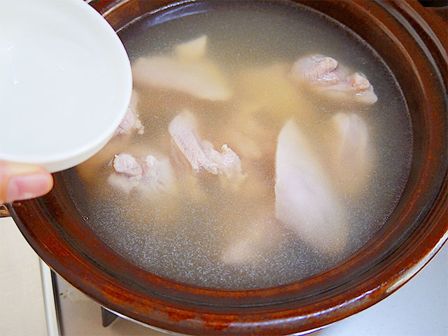 3.鍋に鶏肉と酒を入れて一煮立ちさせます。