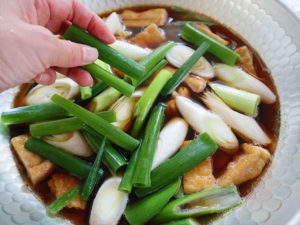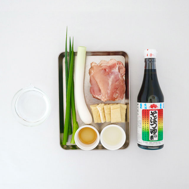 1.鶏モモ肉はひとくち大、油揚げは横に半分切り、1.5cm幅に切る。